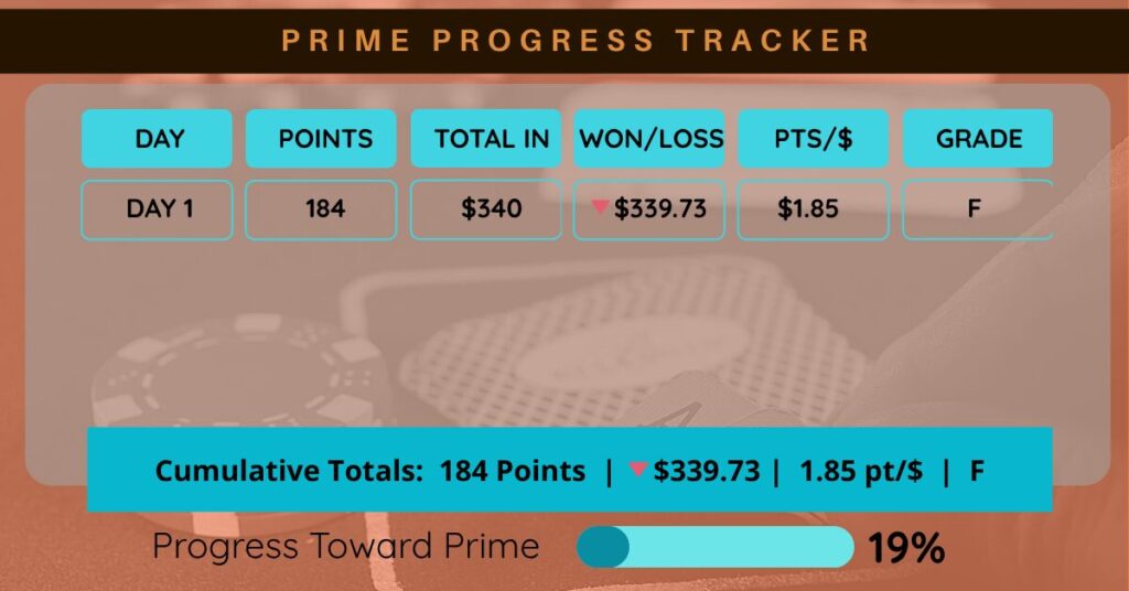 After dinner, it was time to start our Casino Prime renewal play. Before we started, we established our target point total and set our daily budget limit. Each day we’d evaluate our progress toward our point goal compared to how much we had spent and made sure to stop when we either hit our daily point goal OR our daily budget. We of course hit our daily budget limit much quicker than our point goal.