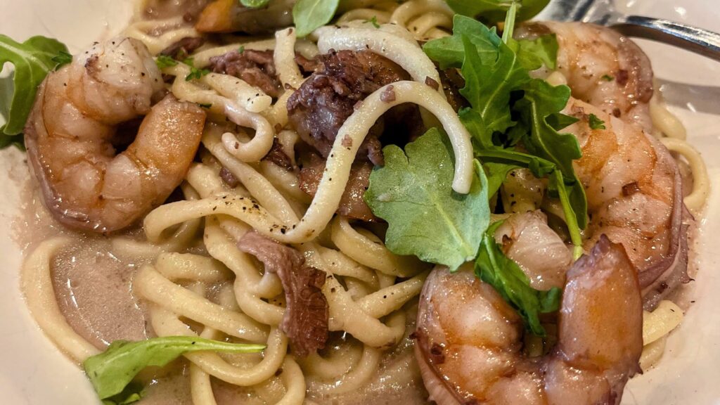 - Main: Shrimp linguini – tasty, though the purple hue of the sauce was unexpected. A little more char on the shrimp would have made it made it more visibly appealing – but it was still delicious.