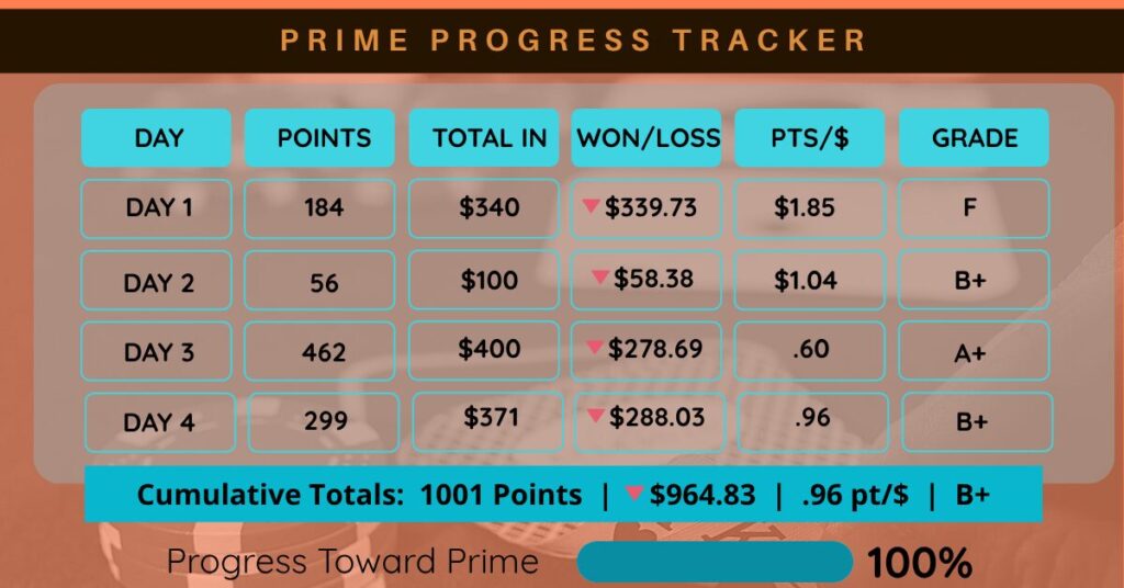 I made a little progress as well – puting $100 in and earned 80 points, ending the session slightly down but happy with the steady churn.